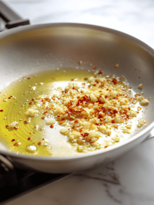 3. Add the minced garlic and chili flakes to the pan. Sauté for about 1 minute until the garlic is golden and fragrant, but not burnt, filling your kitchen with a warm aroma.