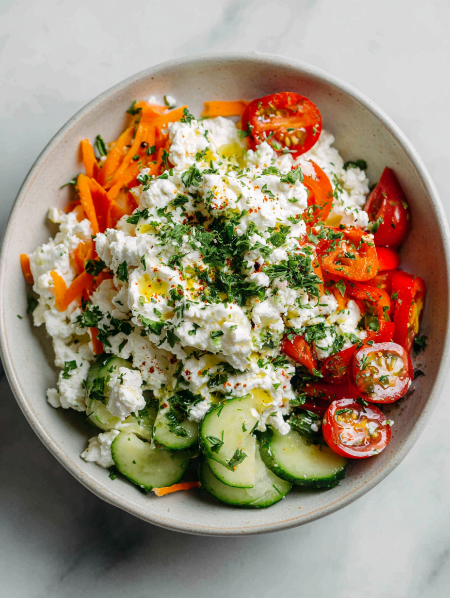 - This recipe was born out of a lazy Sunday morning craving. I had some cottage cheese left in the fridge and a handful of colorful veggies that needed using up. Instead of just assembling a salad, I wanted something more filling but still fresh and quick. That’s how this bowl came together—simple ingredients, big flavor, no fuss.
