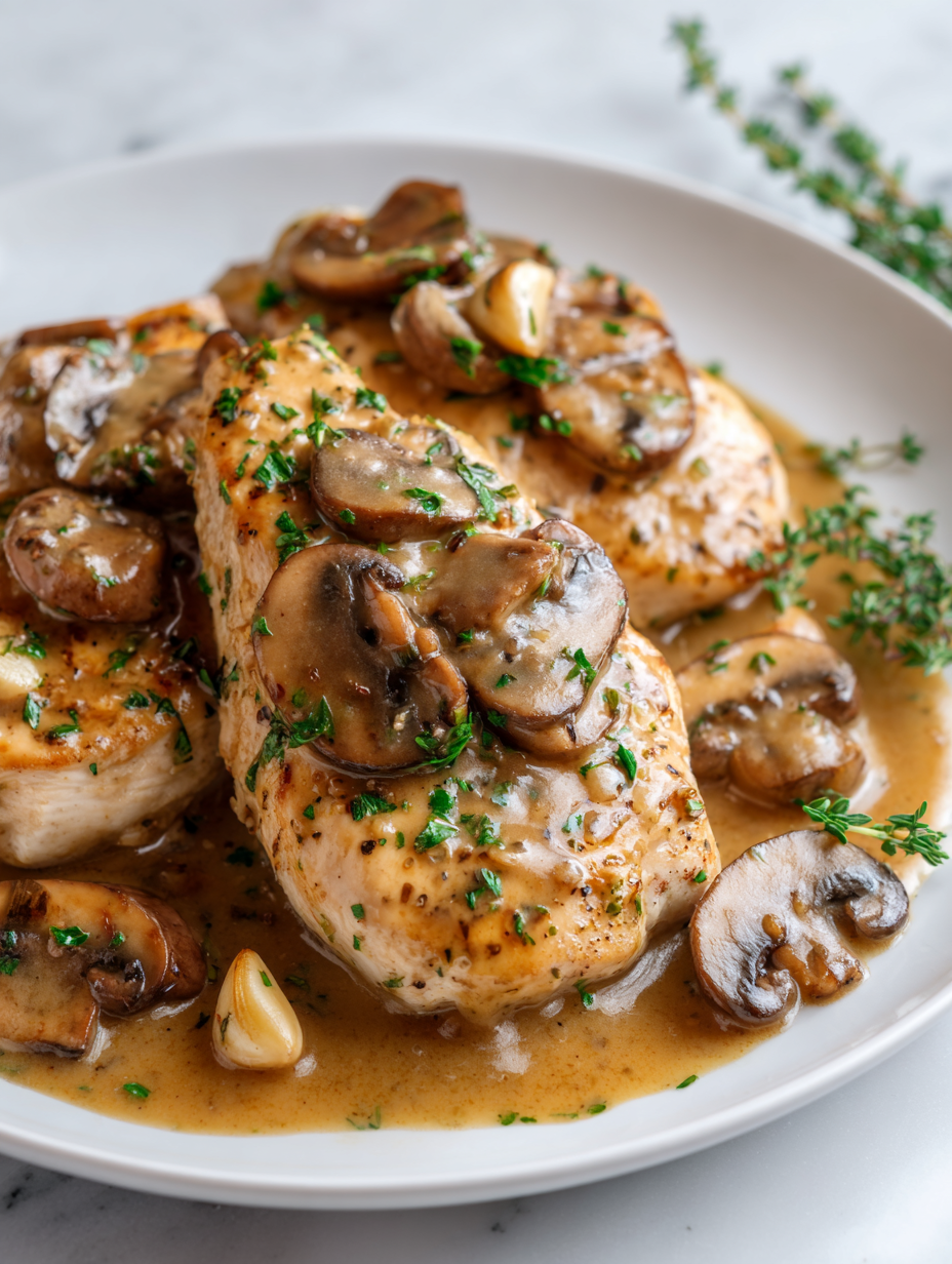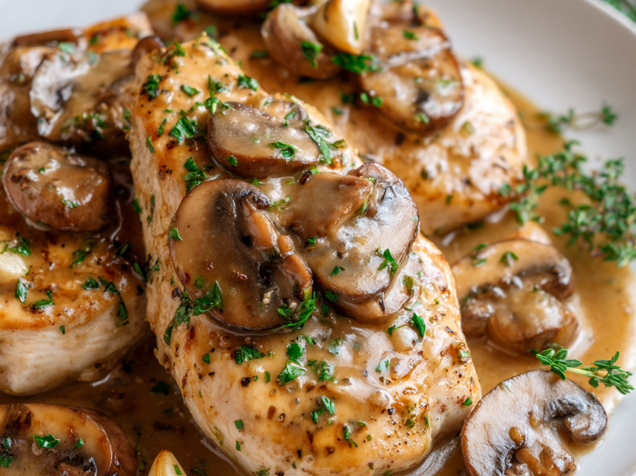 Focusing on how the creamy mushroom sauce can transform simple chicken into a comforting, earthy dish that feels richer and more indulgent than usual weeknight fare.