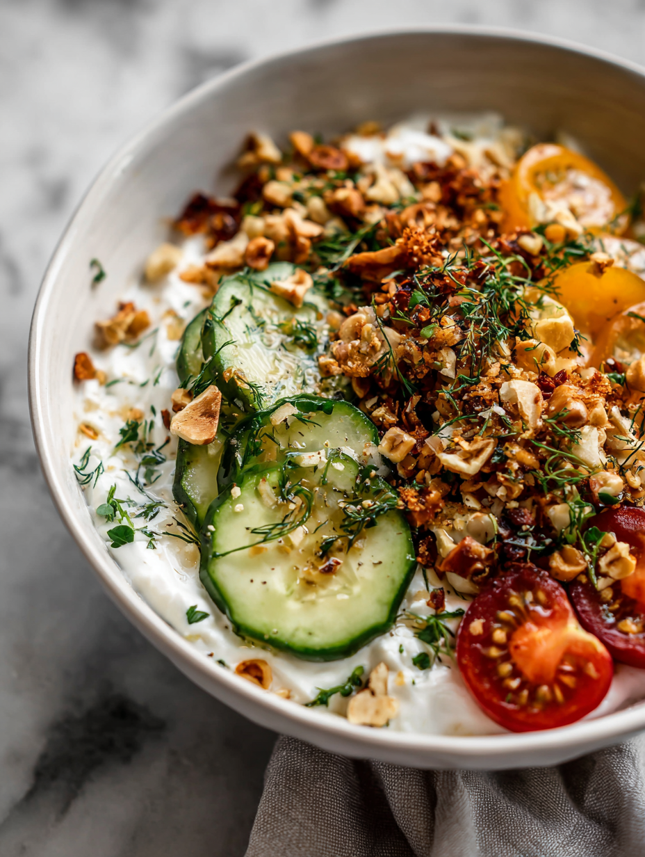 This recipe is about embracing the unexpected—using savory ingredients that usually don’t belong in a typical yogurt bowl. Think toasted seeds, crisp cucumbers, or a drizzle of smoky paprika. It’s honest, flexible, and kind of a messy joy to eat, especially when you’re craving something light but crave a little texture and flavor complexity. Plus, the crunch and saltiness make it feel more like a real snack, not just a health thing.