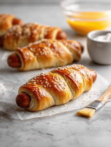 Step 3: Wrap each hot dog with a strip of puff pastry, sealing the edges with a little beaten egg.