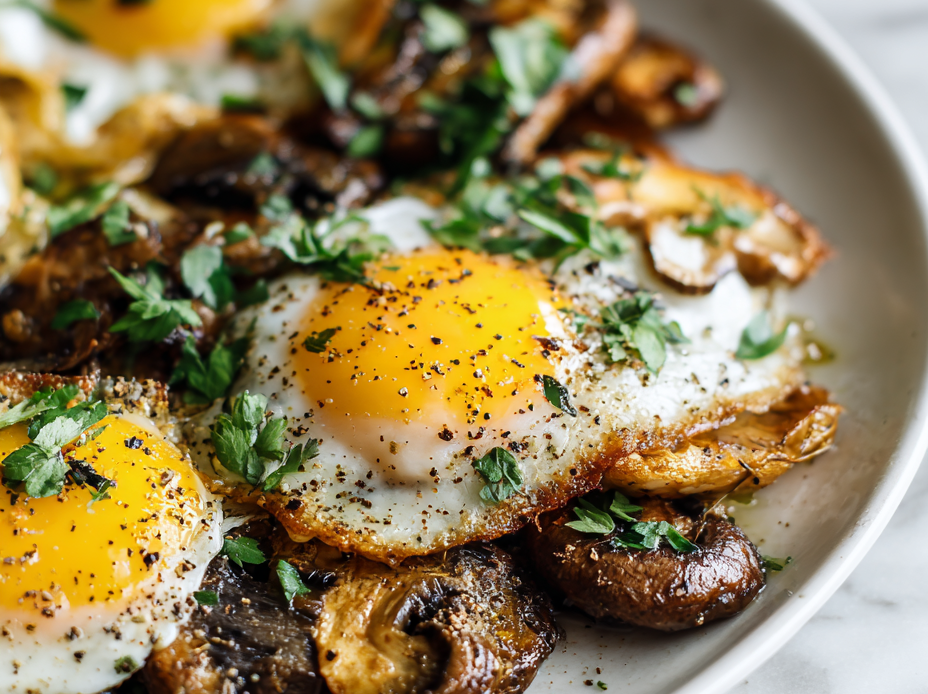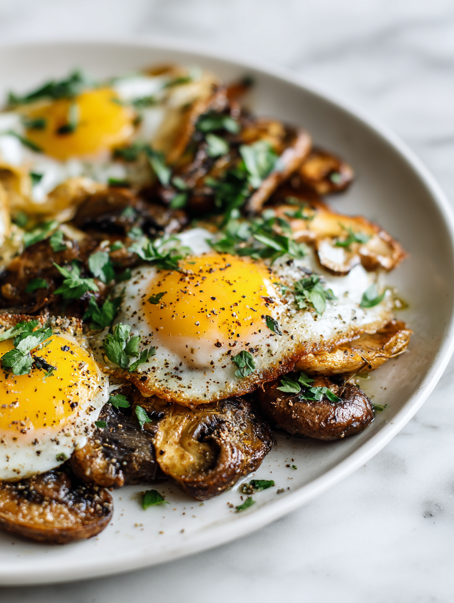 7. Serve immediately directly from the skillet, enjoying the tender mushrooms and perfectly runny eggs with a bright, fresh flavor.