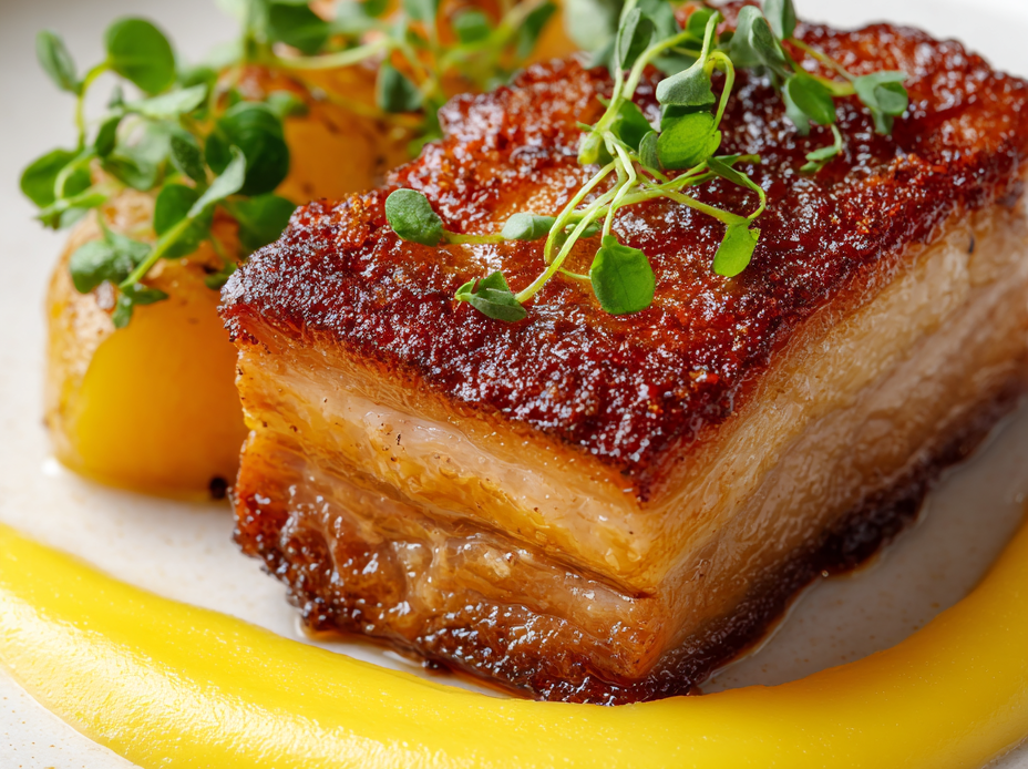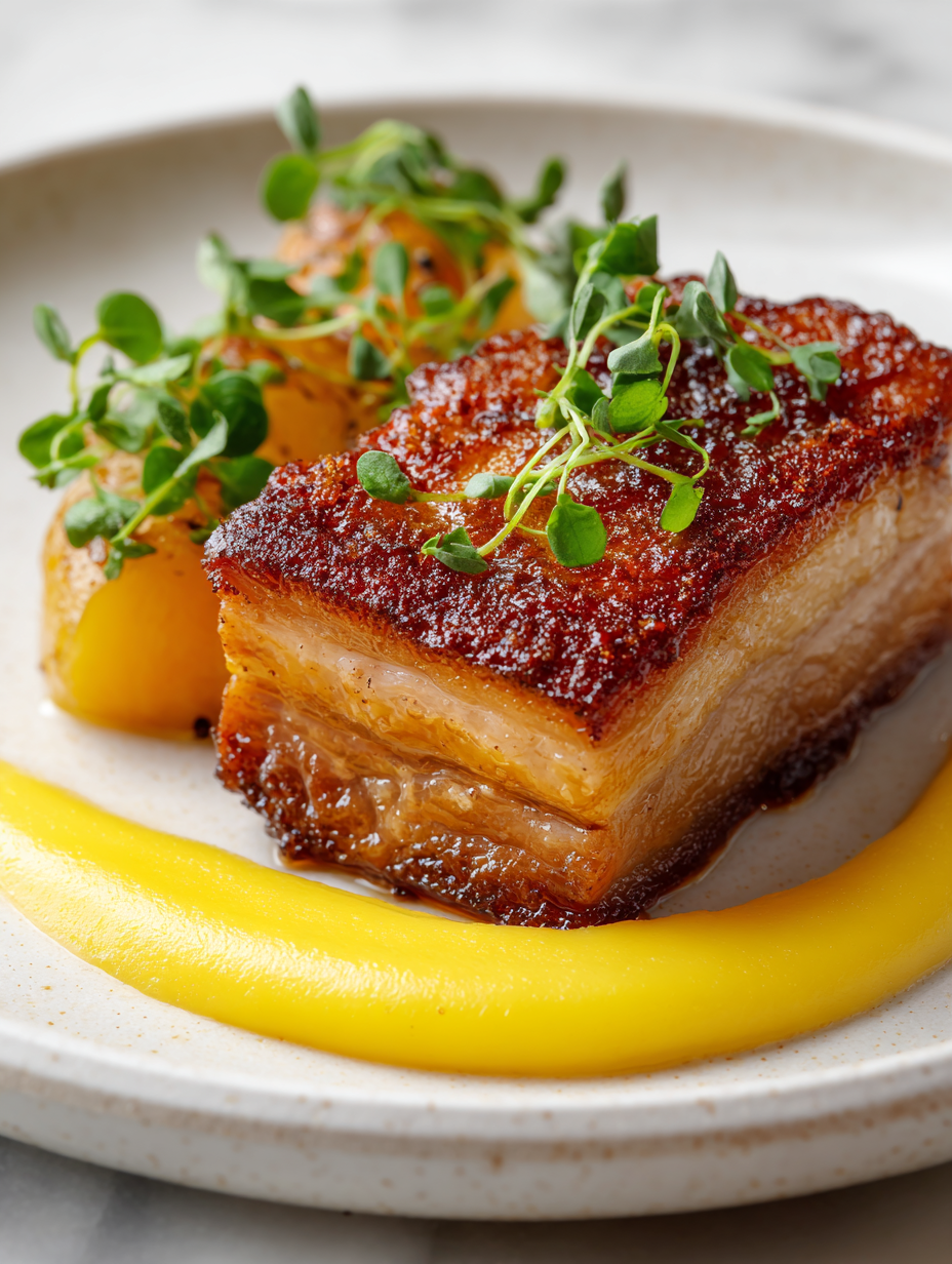 - Slice the pork belly into thick strips, ensuring the crackling remains intact. Plate the slices with a generous spoonful of apple puree on the side. Drizzle any pan juices over the meat for extra flavor. Finish with a pinch of flaky sea salt or fresh herbs if you like.