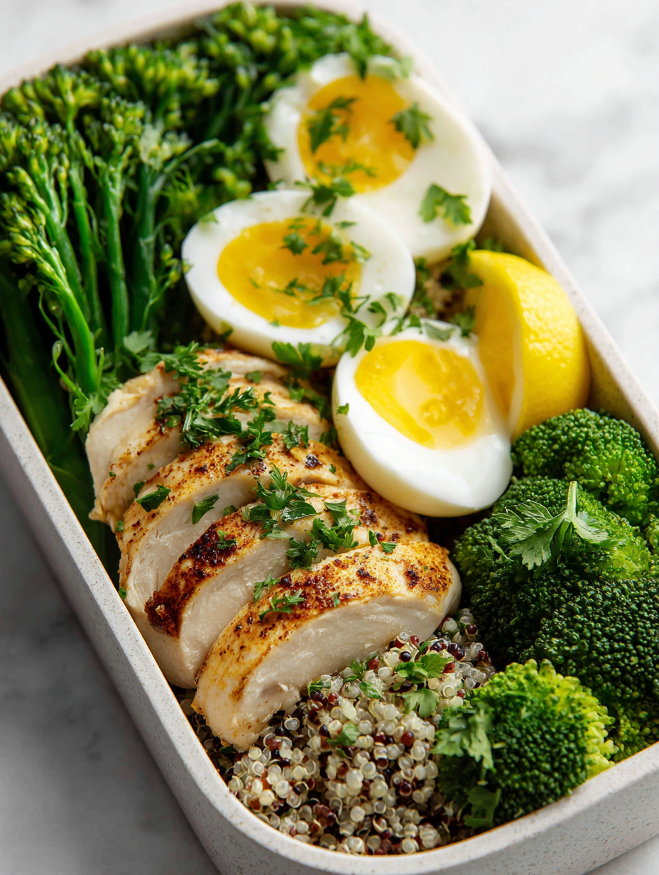 - Arrange all your ingredients in a compartmentalized bento box: place the cooled quinoa in one section, the sliced chicken in another, and the eggs and vegetables in their own spaces. Add dips like hummus or spicy mayo in small containers or sections. Sprinkle toasted nuts or seeds over the vegetables for added crunch.