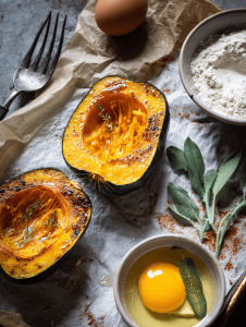 - Preheat your oven to 200°C (390°F) and line a baking sheet with parchment paper. Place the pumpkin halves cut side down on the sheet and roast for 40-45 minutes until the flesh is tender and caramelized. Remove from oven and let cool slightly.