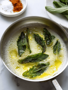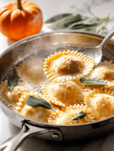 - Gently toss the cooked ravioli in the sage-infused browned butter, coating them evenly and warming through. Serve immediately, garnished with extra sage leaves if desired.