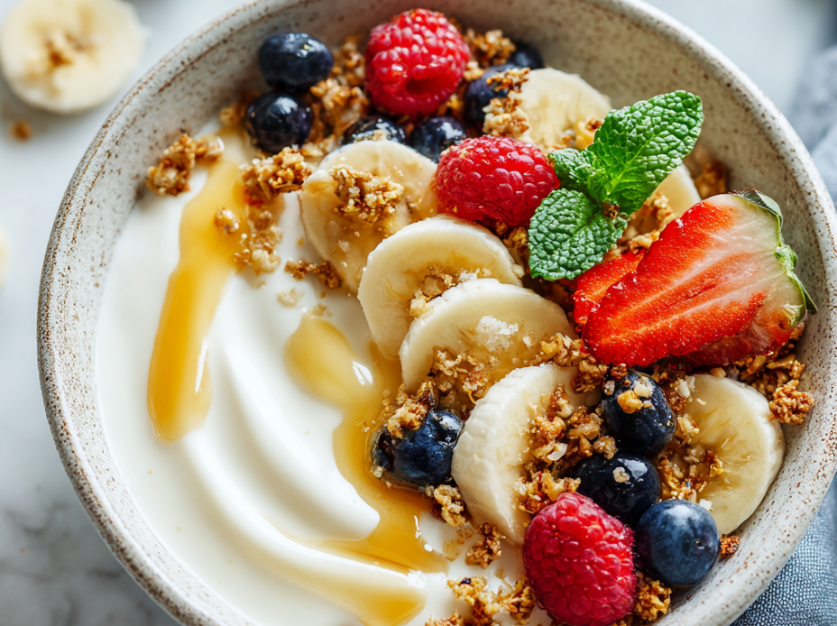 Focusing on how this yogurt protein bowl can serve as a quick, nourishing recovery snack after a tough workout, emphasizing the balance of protein, probiotics, and fresh ingredients to help the body restore energy and gut health.