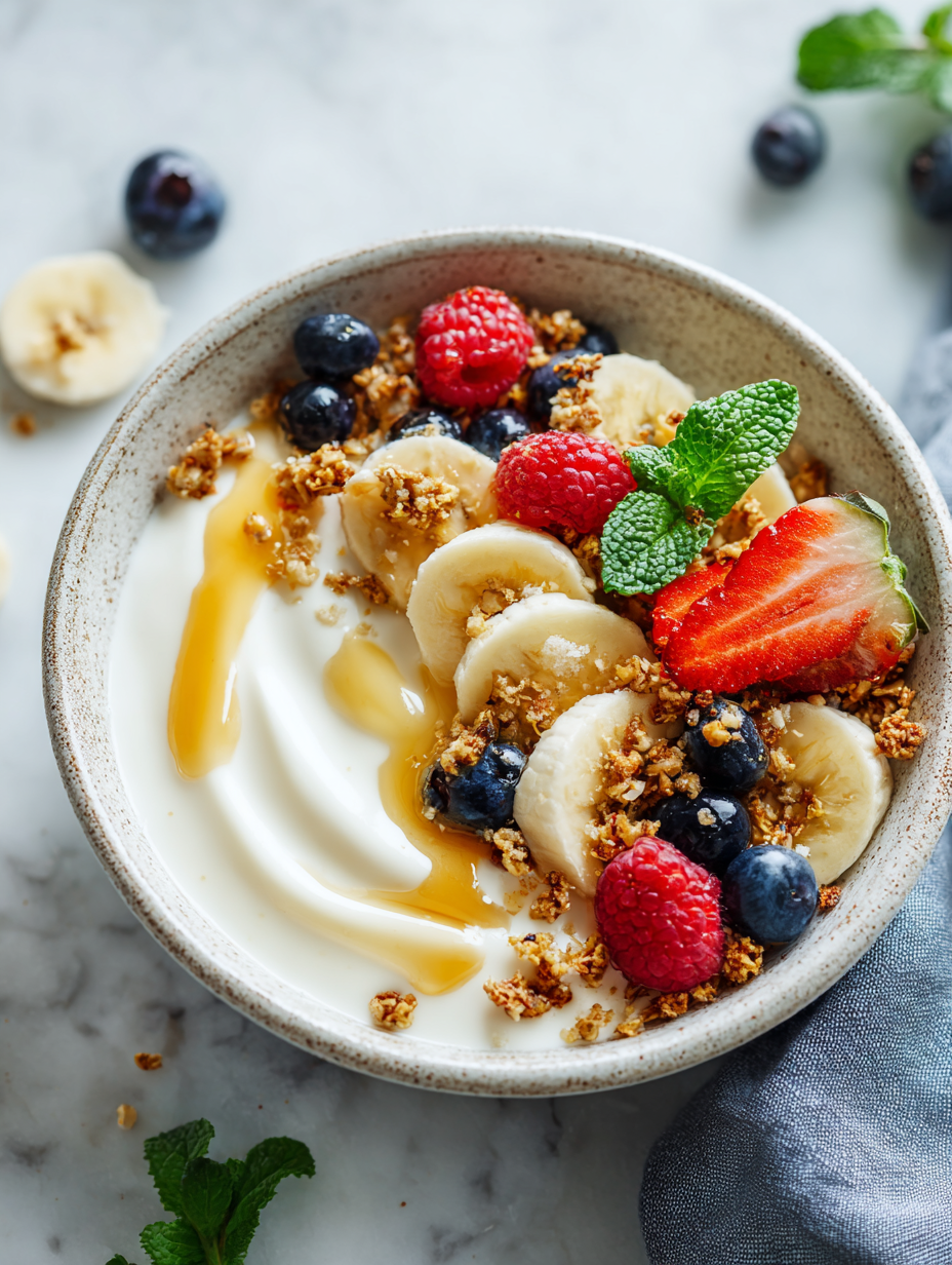 - To serve, add extra fresh berries or a few mint leaves on top for a fresh touch. Enjoy with a spoon, savoring the creamy, tangy, and crunchy contrasts.