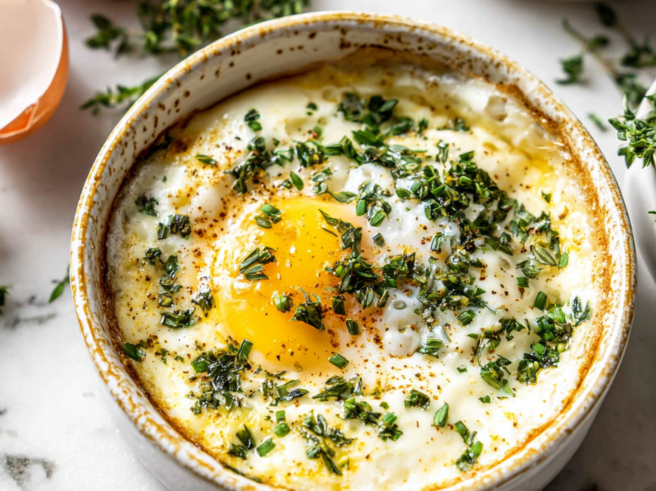 Let the baked eggs rest for a minute to settle. Serve hot, directly from the ramekin, with crusty bread or toast for scooping up the silky yolk and tender whites.
