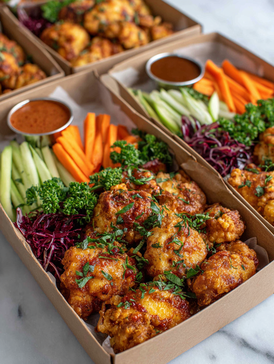 - Assemble your snack box with chicken, pickles, crunchy veggies, and herbs. Serve immediately while crispy and warm for the best experience.