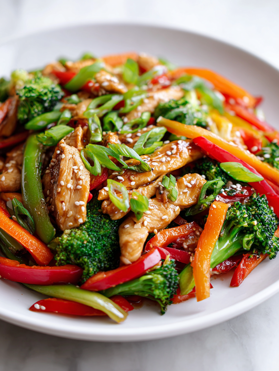 • This recipe took shape during a chaotic week when I needed dinner fast but didn’t want to sacrifice flavor. I started playing around with what I had in the fridge—leftover chicken, some frozen peppers, and a jar of soy sauce—and somehow it all came together in a skillet, smelling of garlic and sesame. That moment, when the stir fry hit the table with its glossy, vibrant coat, felt like a small victory in the middle of a busy life.