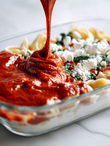 - Arrange the stuffed shells in a baking dish and pour marinara sauce over the top, ensuring each shell is well coated. Sprinkle extra cheese on top for a golden finish.