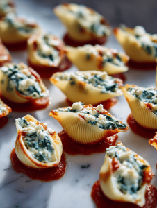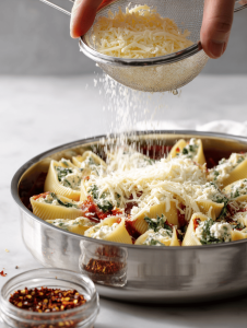 Step 5: Place the stuffed shells in a baking dish, drizzle with marinara sauce, and top with extra cheese.