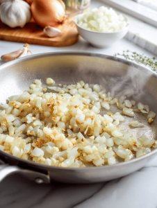 3. In a sauté pan, cook chopped onions and minced garlic over medium heat until fragrant, about 3 minutes, filling your kitchen with a savory aroma.
