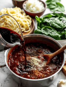 Step 5: Mix in tomato sauce, a pinch of cinnamon, and a splash of red wine, simmer for 10 minutes.
