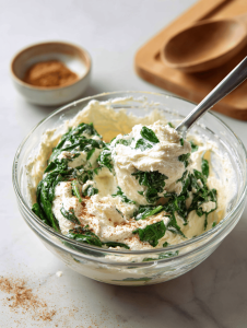 6. In a bowl, combine ricotta cheese with chopped spinach and a pinch of nutmeg, mixing until well blended and creamy.