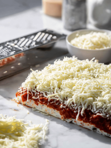 8. Sprinkle shredded cheese evenly over the top layer of sauce, creating a cheesy crown that will turn golden and bubbly during baking.