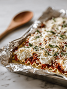 9. Cover the assembled lasagna with aluminum foil and bake for 35 minutes, allowing the flavors to meld and the top to become bubbling.