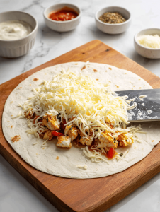 - Lay a tortilla flat on your cutting board and spread a thin layer of shredded cheese over half of it, then add your fillings on top of the cheese.