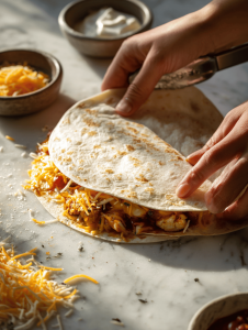 - Fold the tortilla in half to cover the fillings, creating a semi-circle shape.