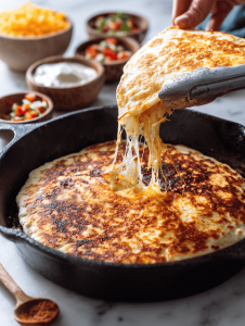 - Carefully transfer the folded tortilla onto the hot skillet and cook for 3-4 minutes, until the bottom is golden brown and crispy, and you see bubbling cheese inside.