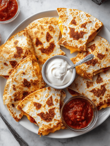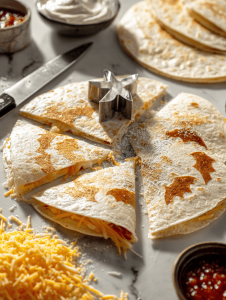 - Arrange the shaped quesadillas on a serving plate and serve with salsa and sour cream for dipping or drizzling.