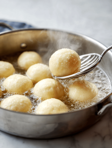 - Boil the dough balls in batches for about 30 seconds each. They will puff slightly and develop a shiny surface. Use a slotted spoon to transfer them to the prepared baking sheet.
