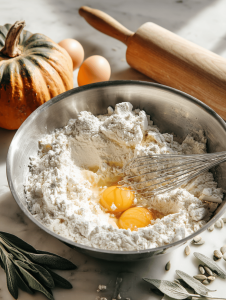 - Pasta dough: Simple flour and eggs, knead enough to develop gluten but don’t overwork.