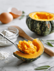 - Scoop the roasted pumpkin flesh into a bowl, mashing it until smooth. Stir in a pinch of nutmeg for warmth and set aside.
