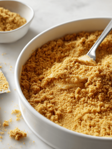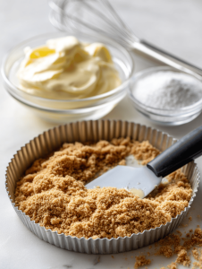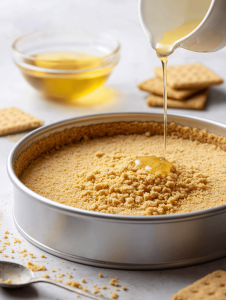 Step 2: Mix crushed digestive biscuits with melted butter until crumbly, then press into a 20cm springform pan.