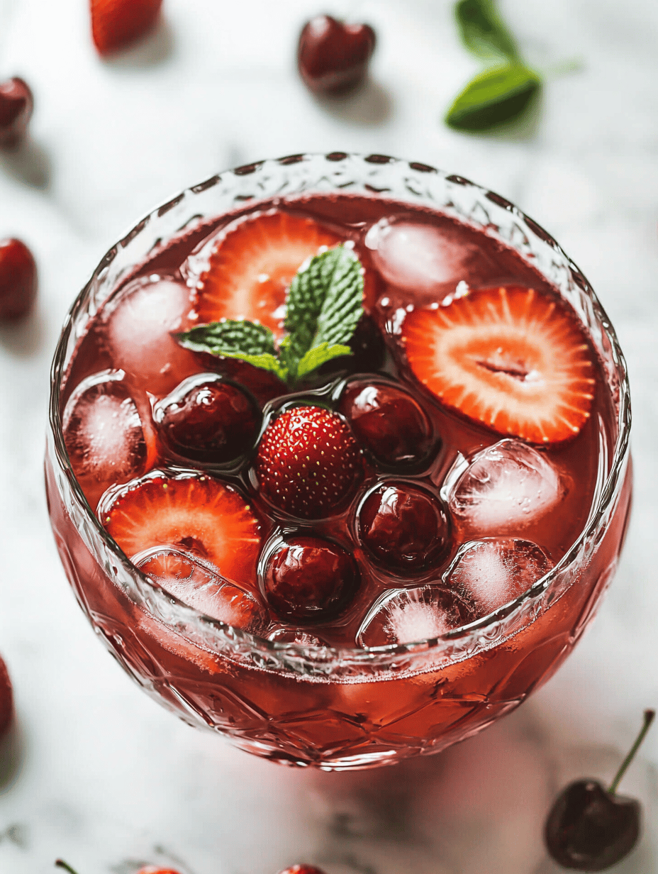 - Fill the punch bowl halfway with chilled fruit punch or berry juice for a vibrant red base.