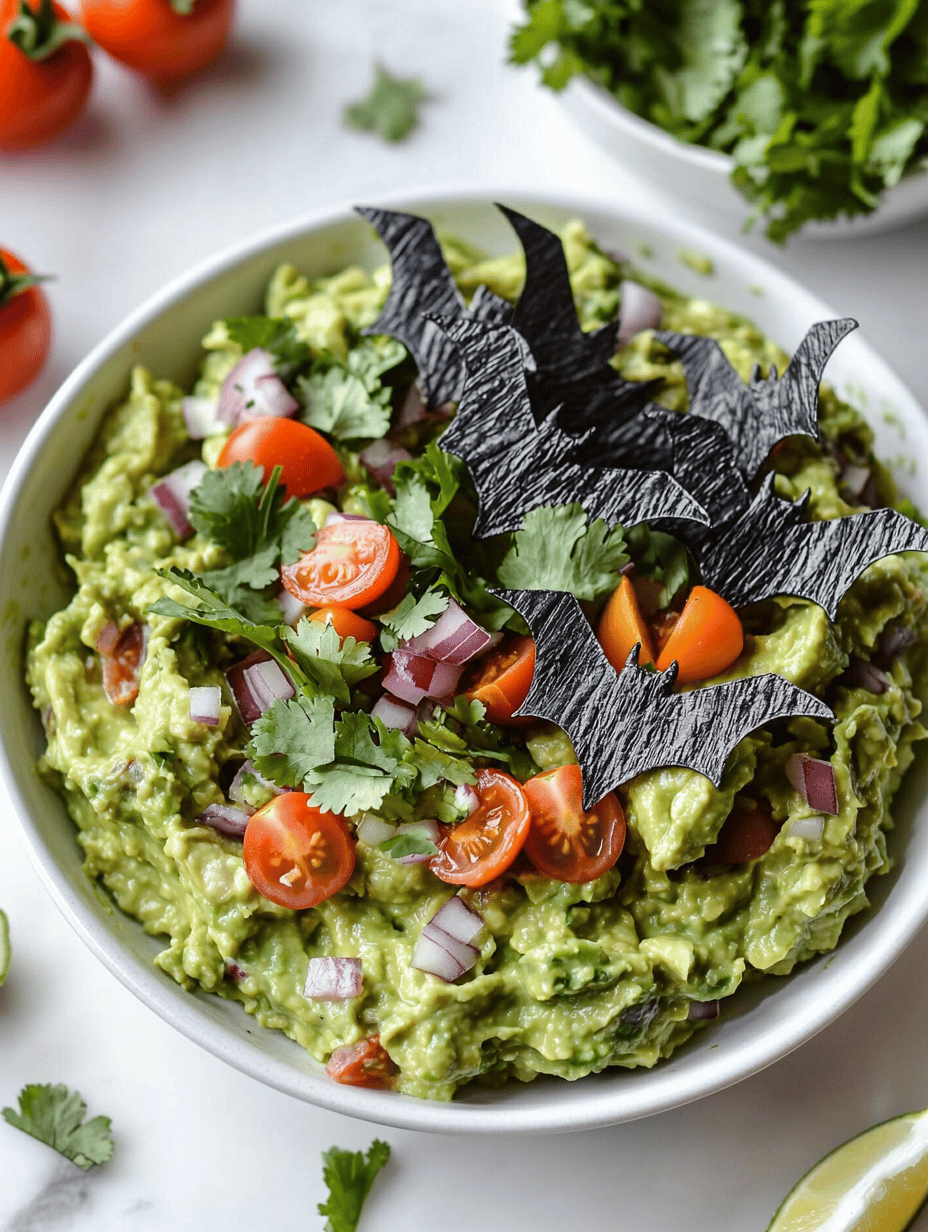 - Transfer the chilled guacamole to a serving bowl. Serve the bat-shaped tortilla chips alongside for dipping. Enjoy the colorful, festive snack with friends or family.