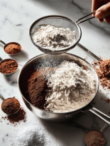 - Sift together the flour, sugar, baking soda, salt, and cocoa powder into a large mixing bowl. This ensures everything is evenly combined and free of lumps.