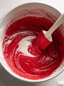 - Pour the prepared red food coloring mixture into the batter, folding gently until the color is evenly distributed and the batter is smooth.