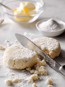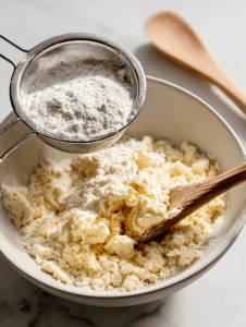 - Gradually sift in the flour, baking powder, and a pinch of salt, mixing gently after each addition until the dough begins to come together and appears crumbly but holds when pressed.