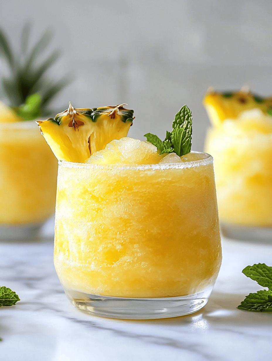 - Pour the frozen pineapple slushie into glasses, allowing the icy chunks to settle slightly for a textured look.