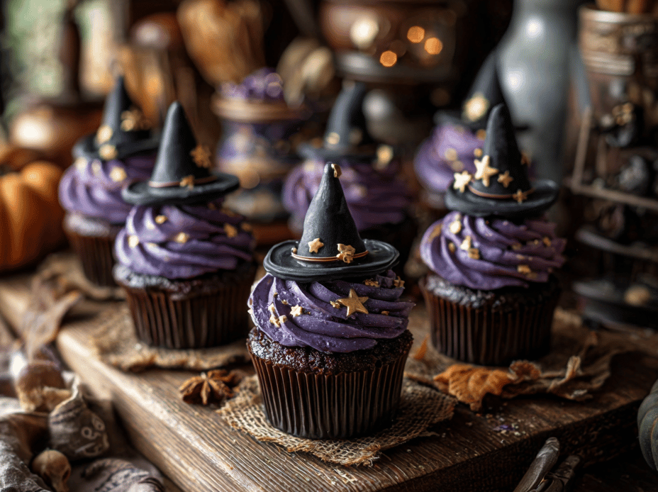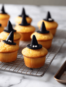 - Once the chocolate cones are set, carefully place one on top of each frosted cupcake to resemble a tiny witch hat and enjoy this playful treat!