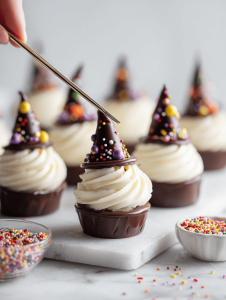 - To create the witch hat decorations, melt the dark chocolate in a microwave-safe dish, then pipe small cone shapes onto parchment paper. Let them set at room temperature until firm and glossy.